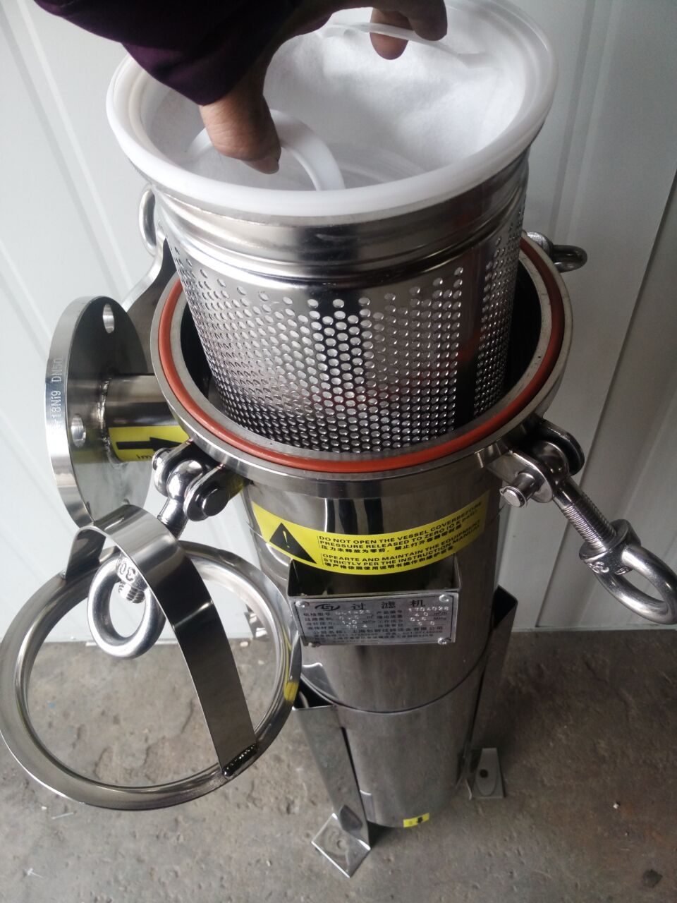 双联袋式过滤器采用标准SUS304/316L不锈钢材质,内外表面抛光处理,滤筒内装有不锈钢滤网/滤袋和滤网支撑篮;顶部装有放气阀,供过滤时排放过滤器内空气作用。上盖与滤筒连接采用快开式结构,更方便清洗(更换)滤网或滤袋,三只可调节式支脚可使滤器平稳放置在地面上。连接管路采用法兰、外丝、活接或卡箍等多种方式连接,进出料阀门采用三通球阀启闭,耐压耐温,操作灵活方便,无料液泄漏更卫生。管道接头采用胀合焊接,经0.6Mpa水压试验,三通外螺纹旋塞启闭灵活,该设备结构紧凑,操作方便,维修简单。此外:可将两个单筒过滤器组装在一个机座上,清洗过滤器时不必停车,保证其连续工作,是不停车生产线过滤装置首选。